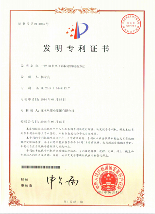 熱烈祝賀啄木鳥漆獲得“一種3D負(fù)離子彩粒漆的制造方法”發(fā)明專利